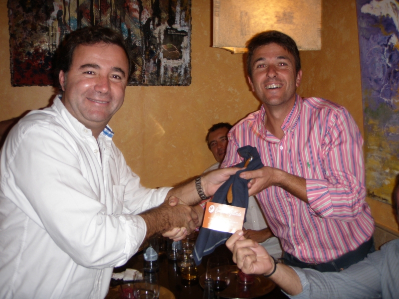 Y grata… ohh ¡ ¡ SORPRESA ¡ ¡ ¡ Dios Existe ¡ ¡ ¡ ¡¡ : Carlos nos tenía preparado un estupendo aperitivo de Jabugos, Gambas y vinos de Crianza en su fabulosa tienda y unos regalitos para los miembros. (En esta última frase, el lector detectará ironía y una sarta de mentiras como puede usted sospechar).