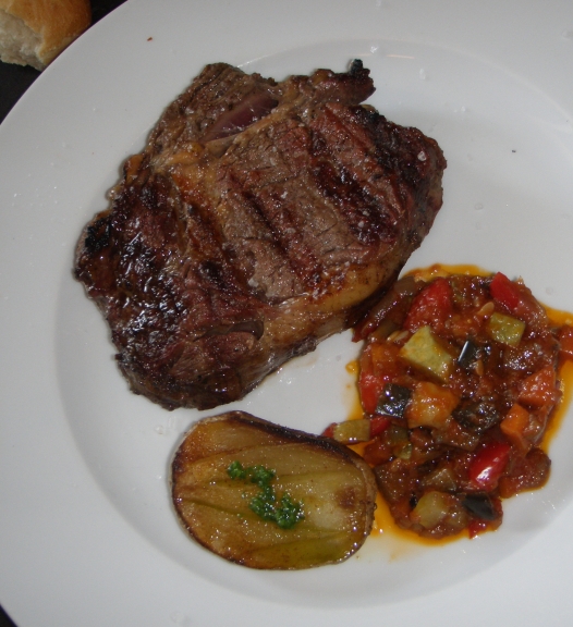– Entrecote 220gr Cebón de raza Aberdeen Angus a la brasa con patata francesa y pimientos asados